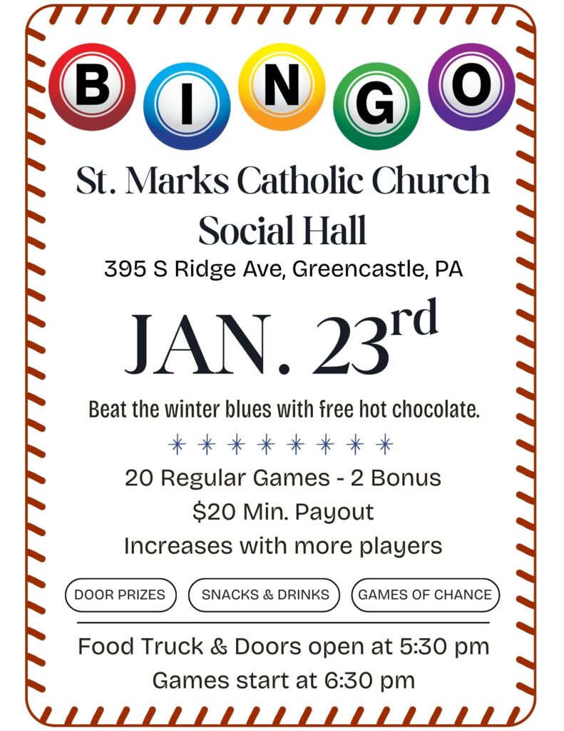 BINGO! Friday, Jan 23 2026, 5:30 PM, in the Social Hall at St. Mark! Food available for purchase! Games starts at 6:30 PM!